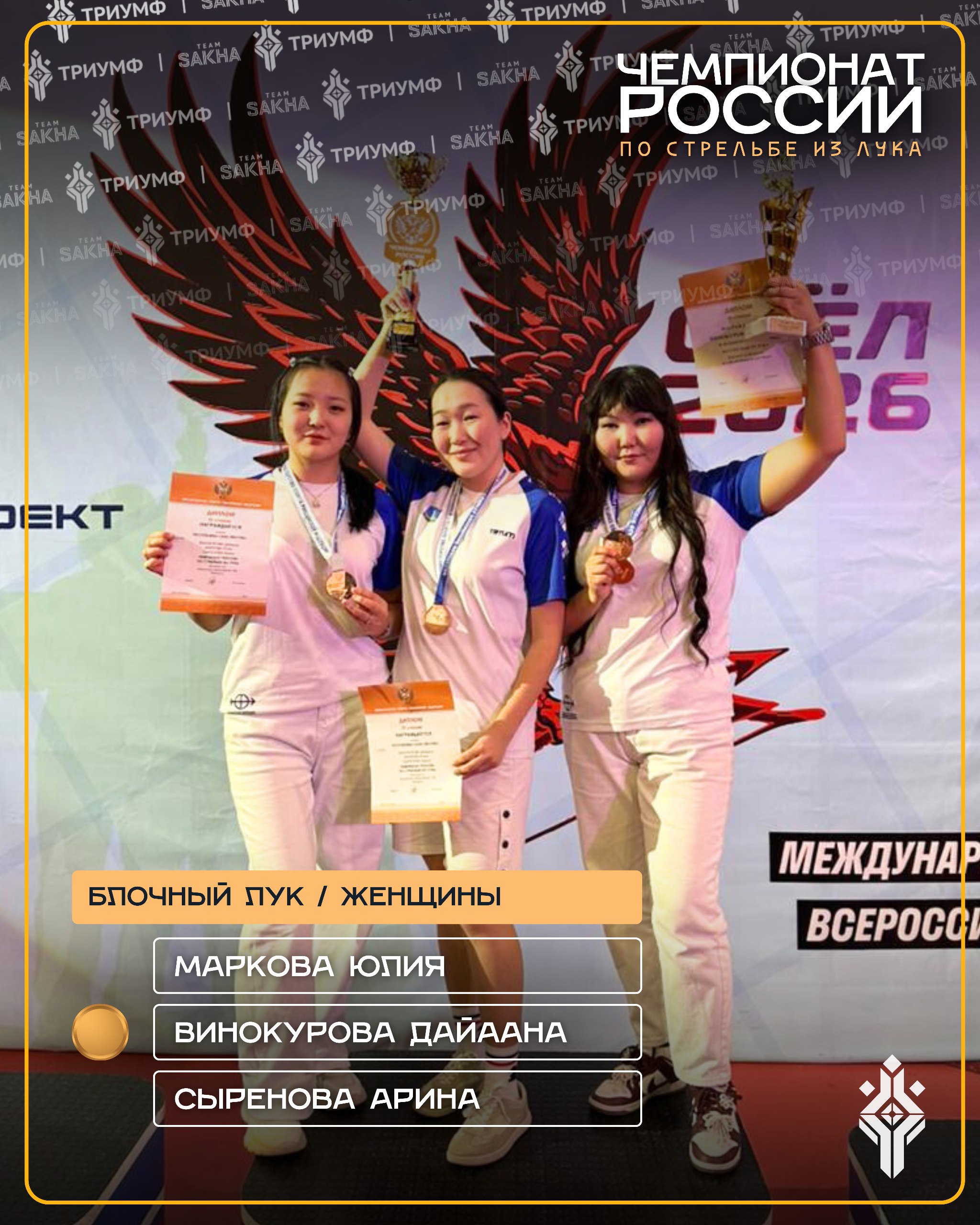 🏹 В Орле продолжается Чемпионат России по стрельбе из лука.👏🏼 Отличный результат показала женская команда Республики Саха (Якутия) в блочном луке! 🥉 В командном зачёте в блочном луке команда Якутии в составе Дайааны Винокуровой, Юлии Марковой и Арины Сыреновой пополнила медальную копилку сборной бронзой чемпионата России. 🔥 В напряжённой борьбе якутские лучницы выиграли со счётом 233:228 (4 серии), одержав победу над командой Бурятии. 🎉 Поздравляем спортсменок и тренерский штаб